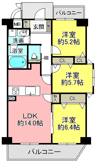 間取内容 | LDK14.0帖 洋室6.4帖 洋室5.7帖 洋室5.2帖 | ||