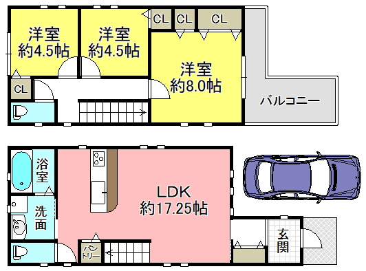 | 間取内容 | LDK17.25帖 洋室8.0帖 洋室4.5帖 洋室4.5帖 | ||