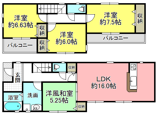 | 間取内容 | LDK16.0帖 洋室7.5帖 洋室6.63帖 洋室6.0帖 和室5.25帖 | ||